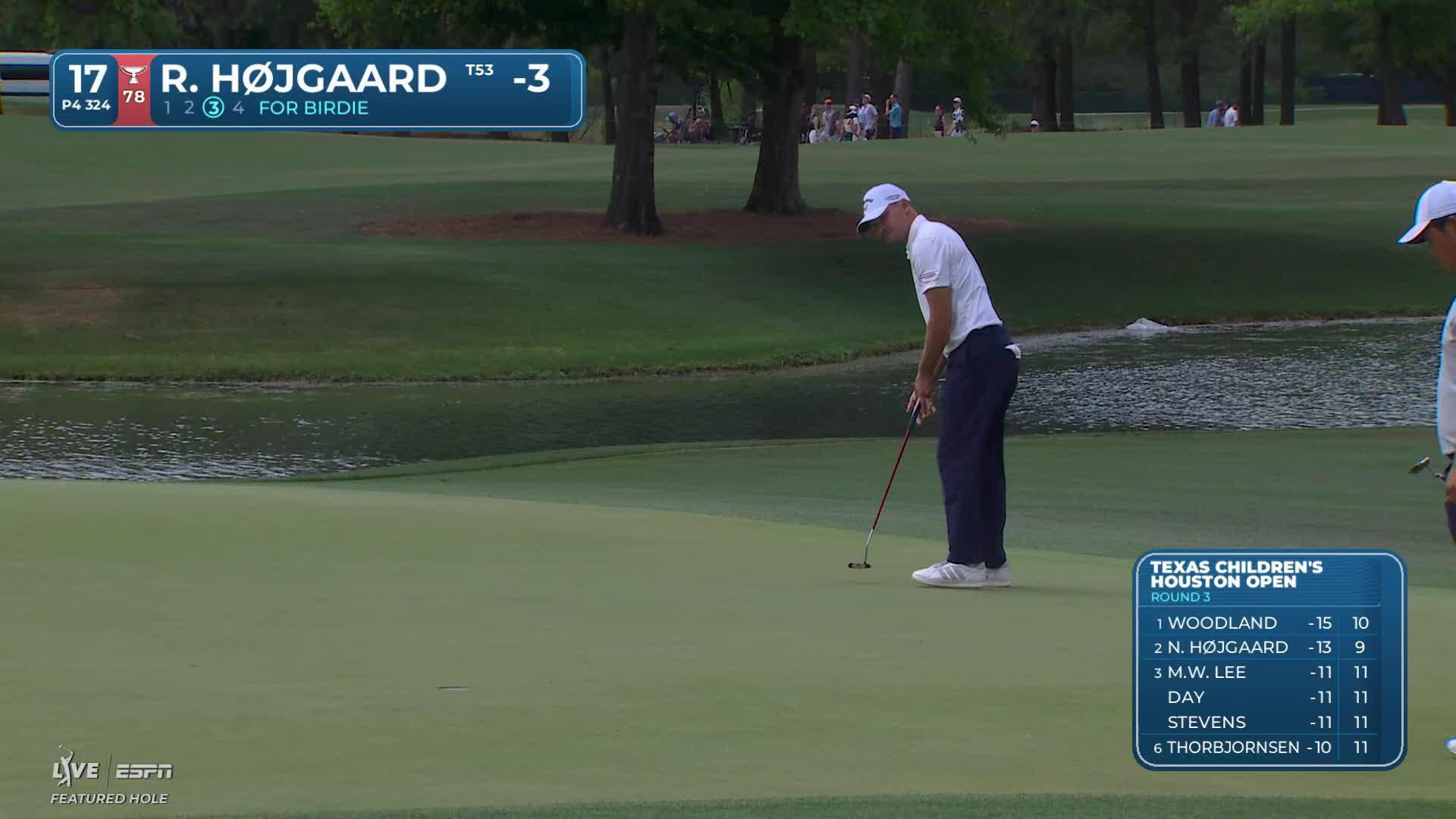 Rasmus Højgaard sinks 23-foot birdie putt on No. 17 at Texas Children's